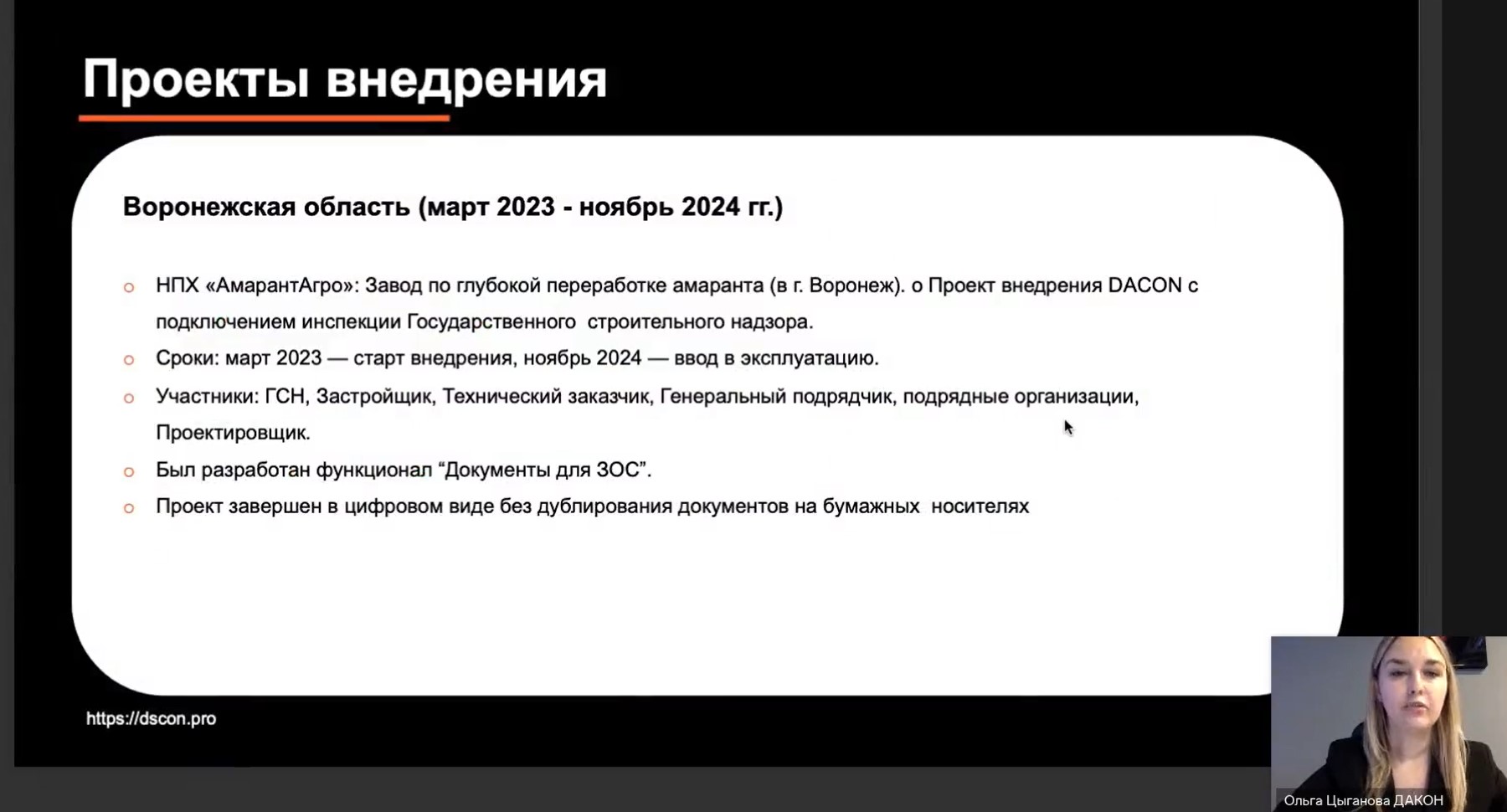 В ходе он-лайн курса директор по развитию ДАКОН Цыганова Ольга рассказала об опыте применения цифрового решения в региональных строительных программах и в проектах с подключением ГосСтройНадзора и РосТехНадзора. Основная часть обучения была построена как детальный разбор функционала сервиса. Представители разработчика Андрей Барбашинов и Денис Аминов провели углубленный практический курс, охвативший полный цикл работы с электронной исполнительной документацией, в том числе ознакомили участников с процессом формирования исполнительной документации в электронном виде средствами цифрового сервиса.
