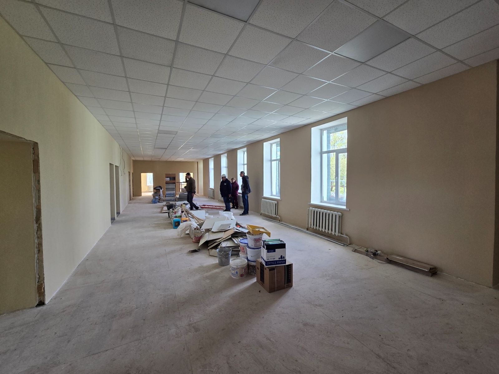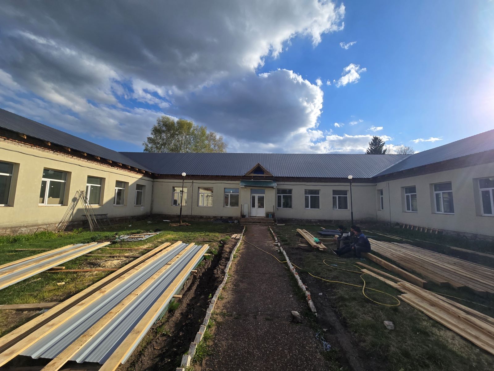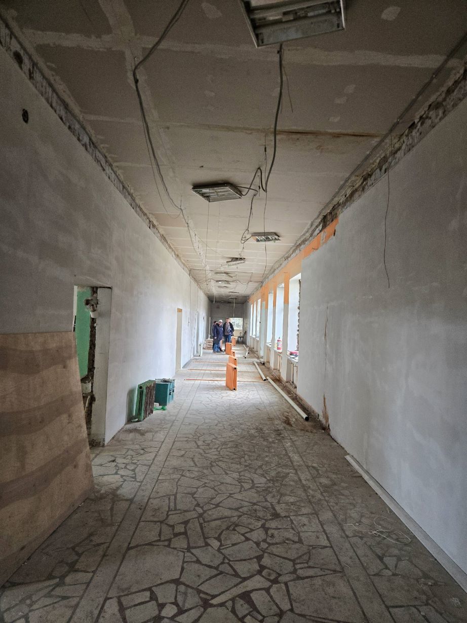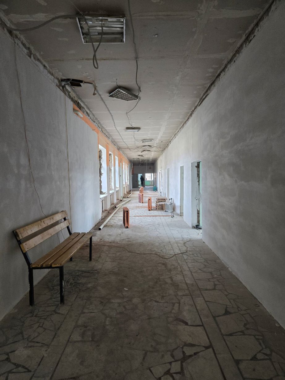 В работе: монтаж вентилируемого фасада, укладка линолеума, монтаж межкомнатных дверей, установка сантехники, подготовка стен под финишное покрытие, монтаж системы отопления и вентиляции в пищеблоке.