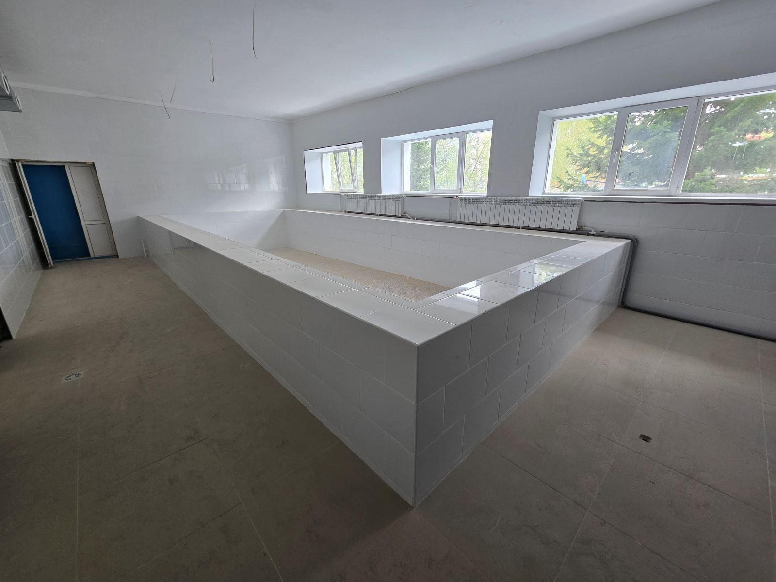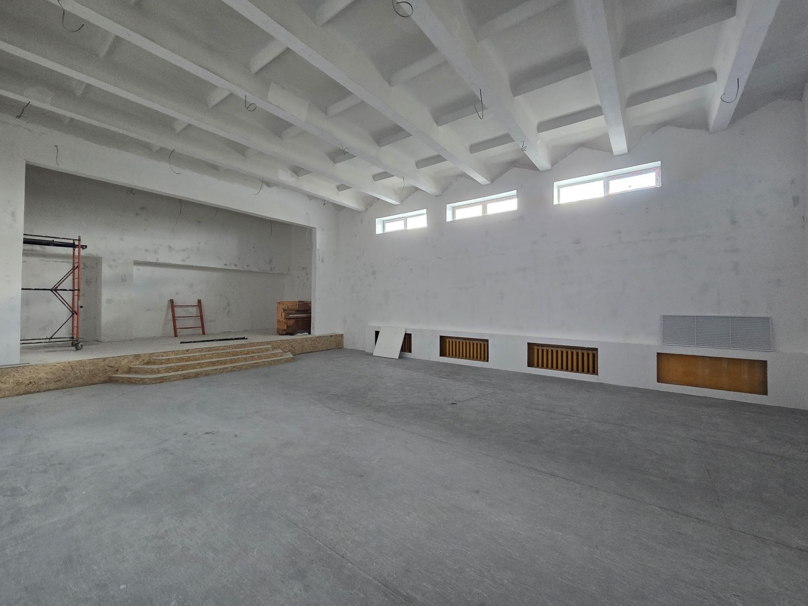 В работе: оштукатуривание и подготовка стен под финишное покрытие, монтаж системы отопления и вентиляции в пищеблоке.